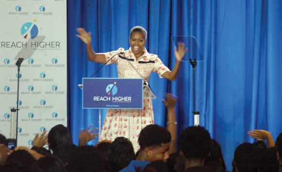 First Lady Michelle Obama kicked off her Reach Higher initiative in conjunction with Education Secretary Arne Duncan’s fifth annual “Partners in Progress” Back-to-School Bus Tour with a college fair and “prep rally” at Atlanta Booker T. Washington High School.
