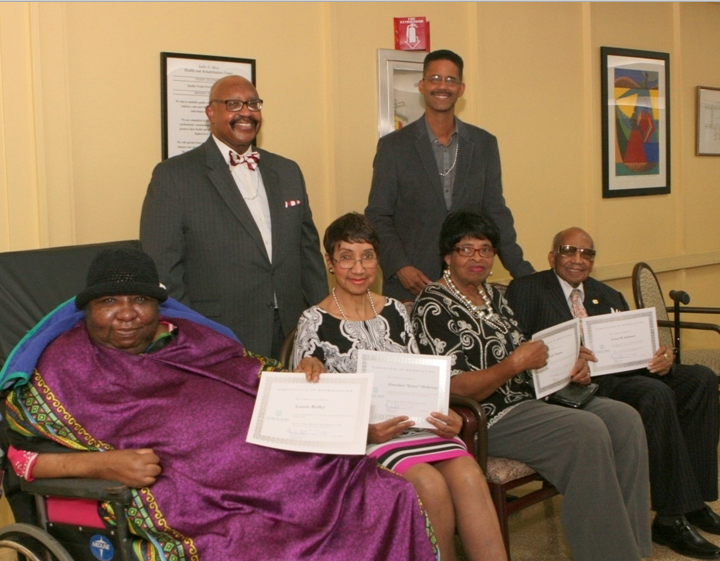 The 70Th Anniversary honorees included (l-r, seated): Resident, Laurie Ridley (20 years). Staffers – Gretchen Holloway and Lola Thomas (49 years), Board member – Sen. Leroy Johnson (47 years). Standing are President/CEO, Charles Robinson, Jr. and Board Chair, Samuel Bacote, III.