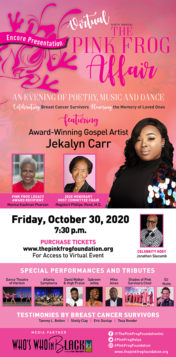The inspirational evening will be hosted by comedian and actor Jonathan Slocumb and feature a musical tribute by GRAMMY® Award nominee and GMA Dove Award-winner, Jekalyn Carr. Veteran journalist and broadcaster Monica Kaufman Pearson will receive the Pink Frog Legacy Award. Several recipients of Pink Frog services will also share survivor testimonials. Other event highlights include performances by the Dance Theatre of Harlem, Atlanta Symphoria, and poet Sabreen Jolley, among others. This year, former Legacy Award recipient, Rogsbert Phillips-Reed, M.D., will serve as honorary host committee chair. Past honorary chairs include Congresswoman Lucy McBath, Congressman John Lewis, Former Atlanta Mayor Shirley Franklin, and Judge Glenda Hatchett, to name a few.