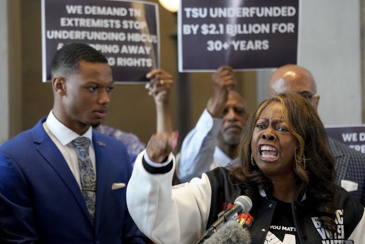 LaTosha Brown, of Black Voters Matter, speaks during a press conference at the State Capitol on April 1, 2024, in Nashville, Tenn. (The Associated Press, George Walker IV)