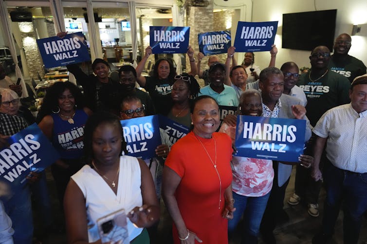 Attendees at a party organized by Democrats from Miami’s Haitian-American community gather for a group photo. (The Associated Press, Rebecca Blackwell)