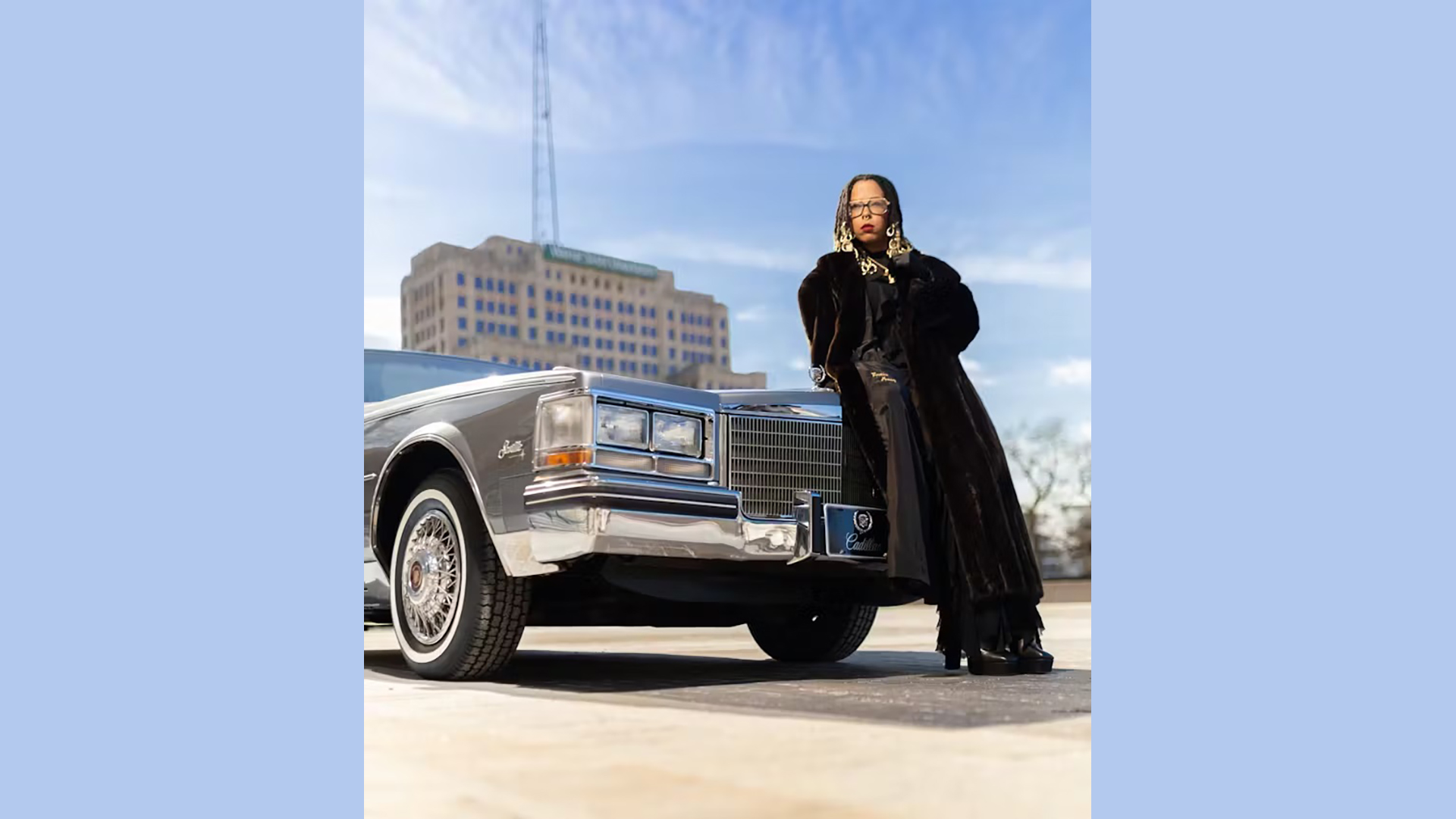 Tiff Massey poses with a Cadillac to promote her exhibition about metalsmithing, jewelry and the city’s streets. Detroit Institute of the Arts