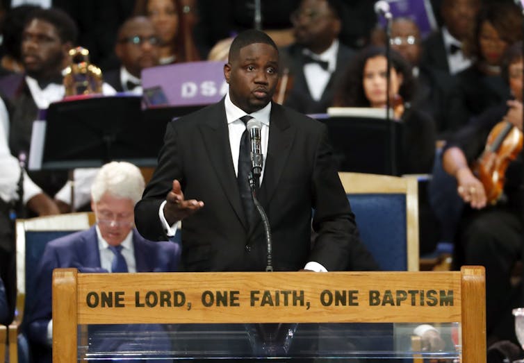 Pastor Solomon Kinloch speaks at Greater Grace Temple in Detroit in 2018. Kinloch is a trusted source of news in Michigan, according to the author’s research. Paul Sancya/AP Photo