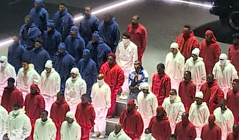 Dozens of dancers wearing red, white, blue, and black jumped out of the GNX vehicle and formed an American flag. Kendrick rapped “DNA” while in the middle of the flag, divided into two parts.